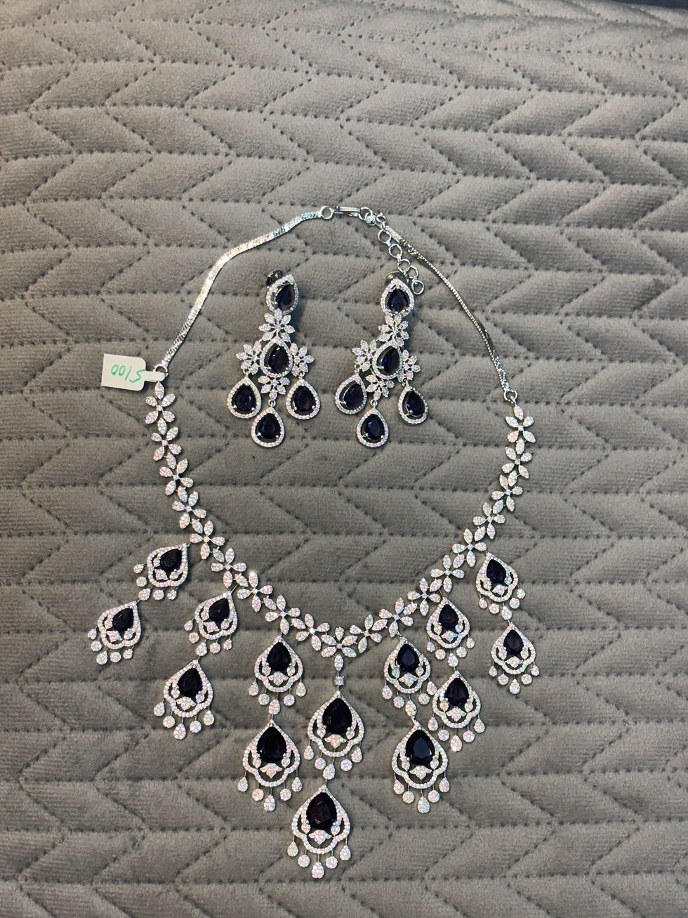 Dual layer invisible setting diamond necklace and earrings - Silver polish