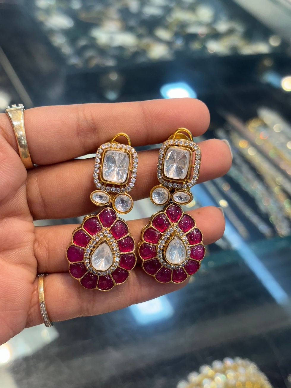 Potta meena work moisannite Polki drop earrings - Ruby